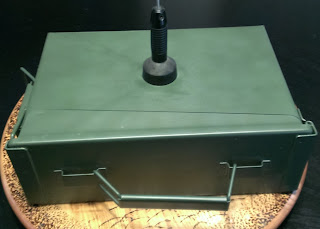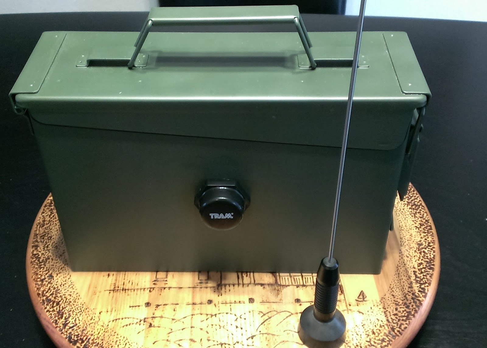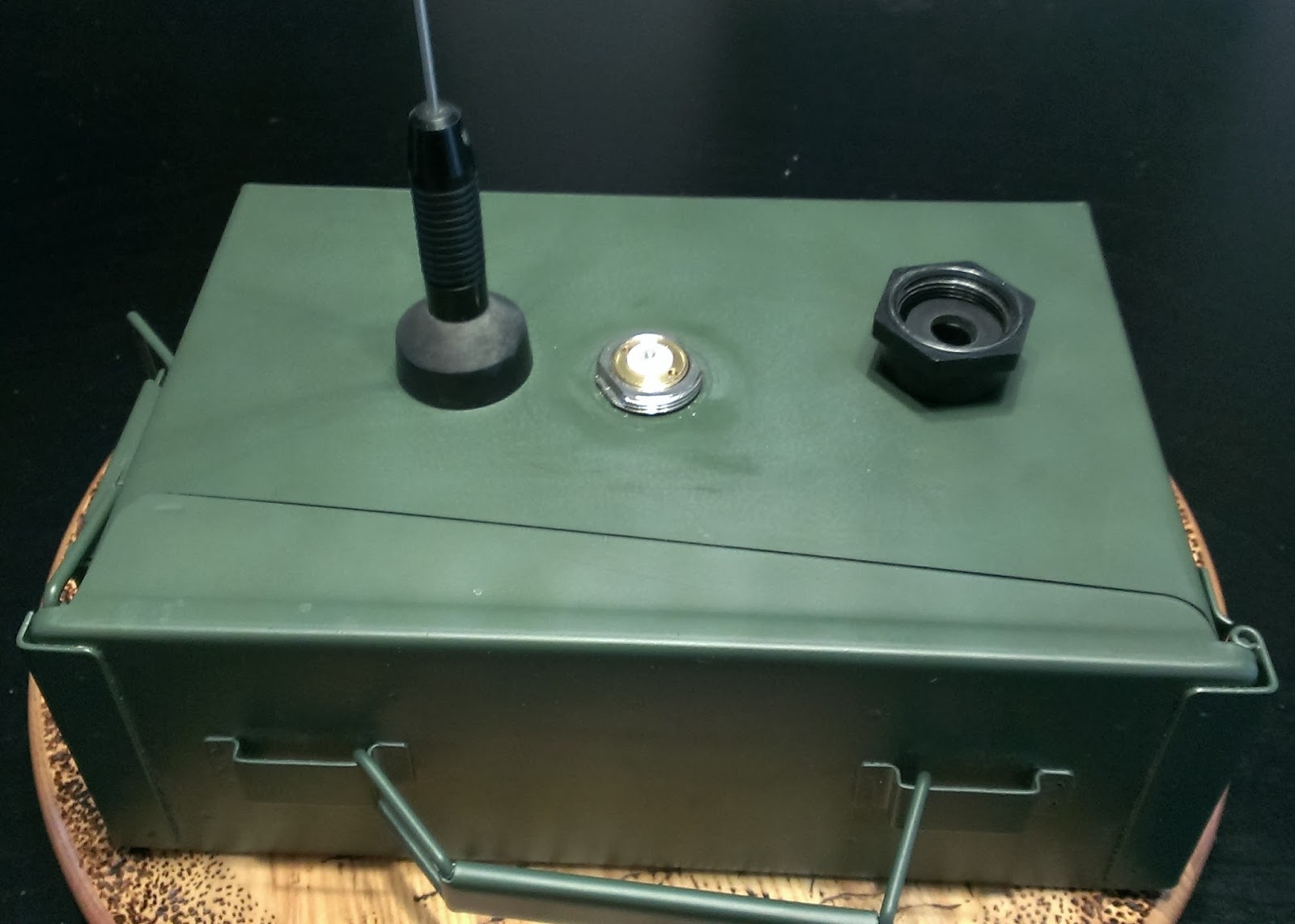 Laying the ammo can on its side, this was clearly a good spot for an NMO antenna mount. I had one just laying around. Drilled a 3/4 inch hole and poof, the antenna mount was ready.